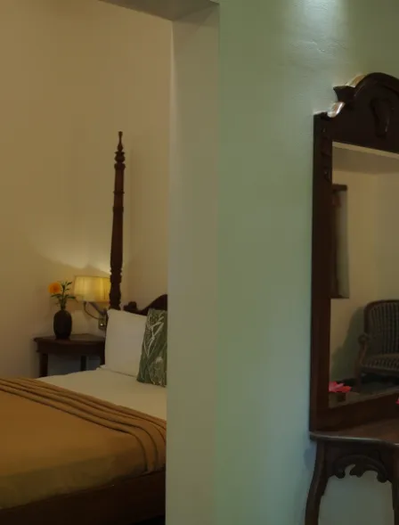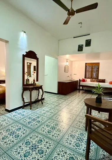 Our Ayurvedic homestay features seven serene rooms, a peaceful library, an organic garden, a dedicated yoga studio, three treatment rooms, a private kitchen, a welcoming dining area, free Wi-Fi, laundry facilities, and a walkway that circles the entire property for tranquil strolls amidst nature.